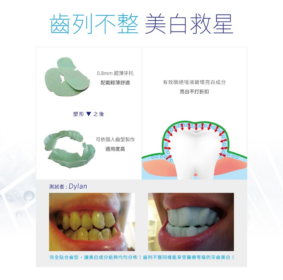 *獨家牙托技術,符合個人齒型,齒列不整的人也能有效美白